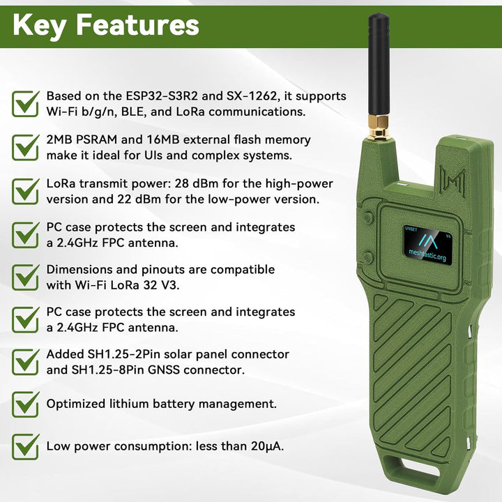 - ESP32-S3R2 + SX1262 chipset – Supports Wi-Fi (802.11 b/g/n), Bluetooth BLE, and LoRa communication.